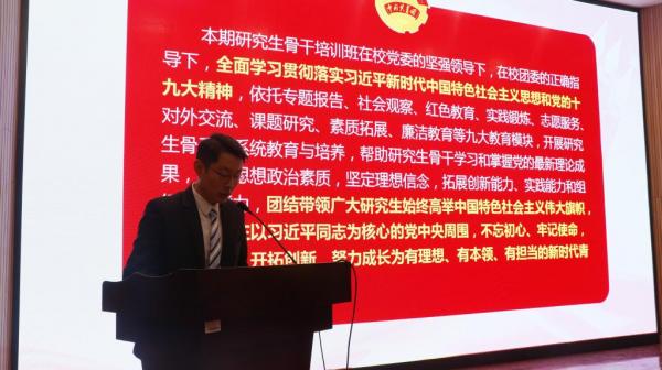 研工部部长贺炳彦在开班仪式上讲话。他充分肯定了研究生骨干在学校建设发展方面做出的积极贡献,并勉励培训班学员坚定理想信念,加强理论素养,做一名马克思主义的坚定拥护者;勤奋刻苦学习,坚持知行合一,做一名马克思主义的勇于实践者;争当先锋模范,甘于奉献社会,做一名马克思主义的积极传播者。