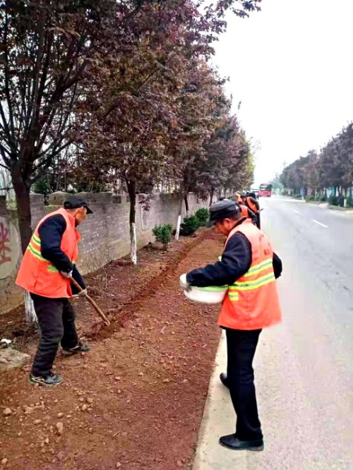 扶风县绛帐镇环卫工人正在道路旁种百日菊。